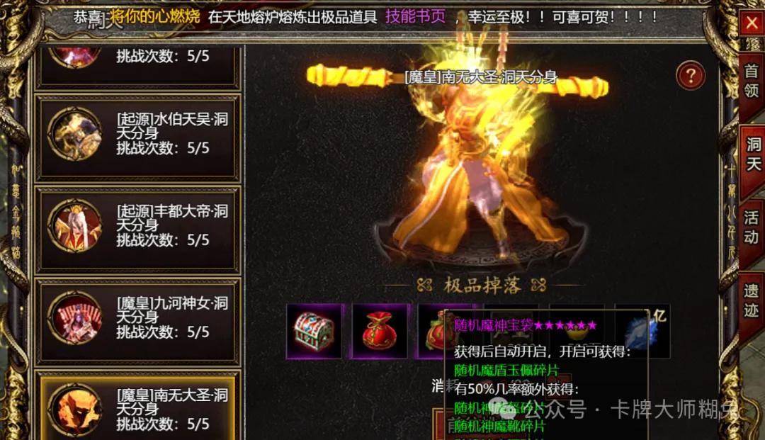 洞天BOSS是获得神魔碎片的重要途径,每人每天最多可以挑战5次,可以获得各种稀有材料,随机法宝解封符和保底的神魔碎片和额外出的材料,重点数量随机,