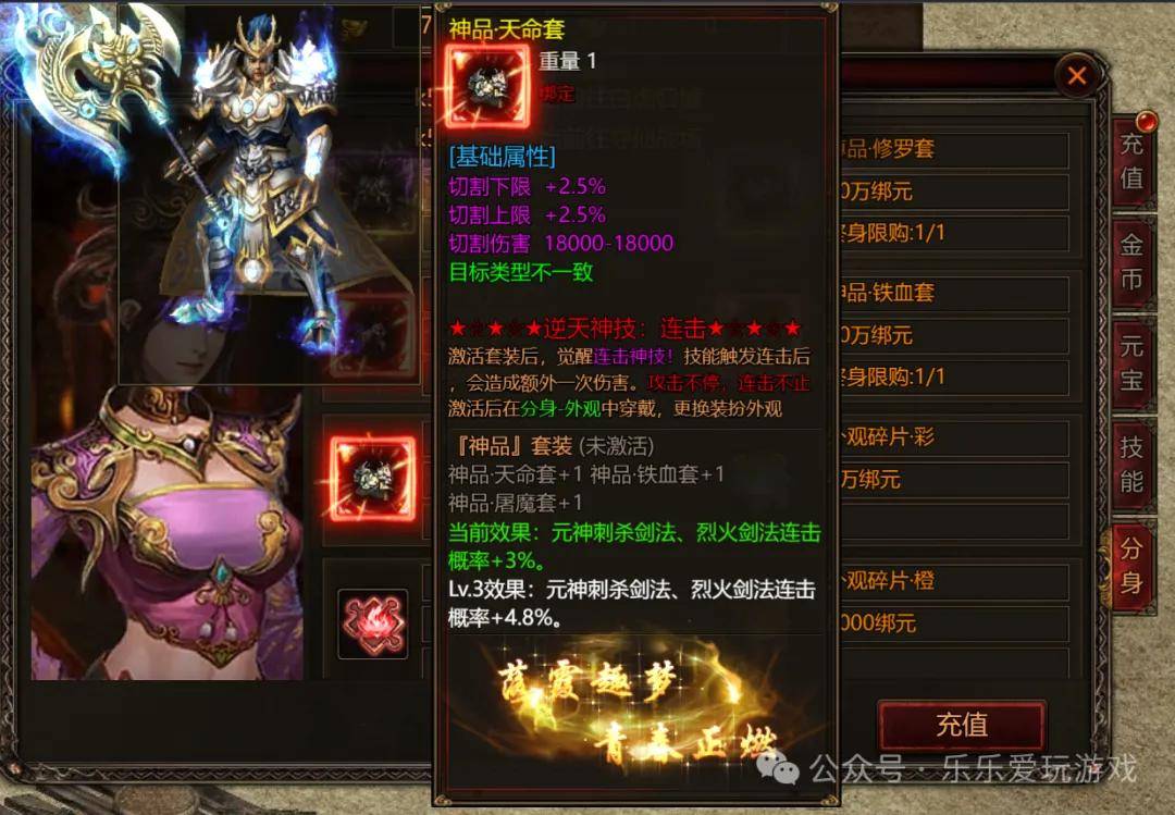 『神品』套装(未激活)神品.天命套+1 神品.铁血套+1神品.屠魔套+1当前效果:元神刺杀剑法、烈火剑法连击概率+3%。