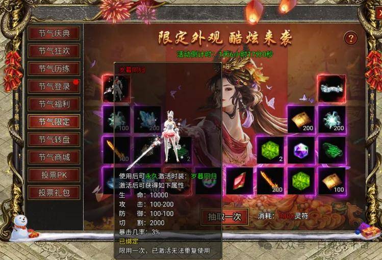 本次活动的重头戏在节气限定和节气转盘上,节气限定9800符抽取一次,可以抽20次,光是时装称号生肖3自选箱和至尊宝石就已经回本了,其他材料相当于白拿的。