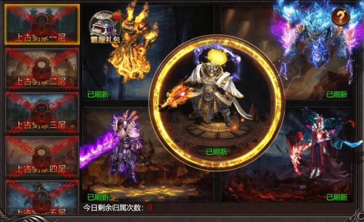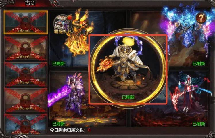 当解锁多层剑家时,建议挑战最高层古剑霸主;b.古剑霸主每日18:00刷新,与归属者同行会的成员都可以获得归属奖励,地图内其他参与者可以获得参与奖励;(特别提醒,归属有5倍的古剑爆率提升)