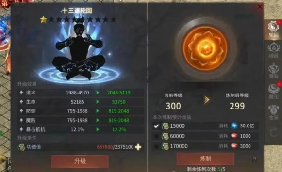 8转开启后,你会在界面里看到【轮回】入口。这个系统的逻辑很简单:消耗经验或钻石炼制【功德值】,用功德提升轮回等级,每升一级都能拿到魔法、生命、防御、魔防和暴击抵抗的加成。