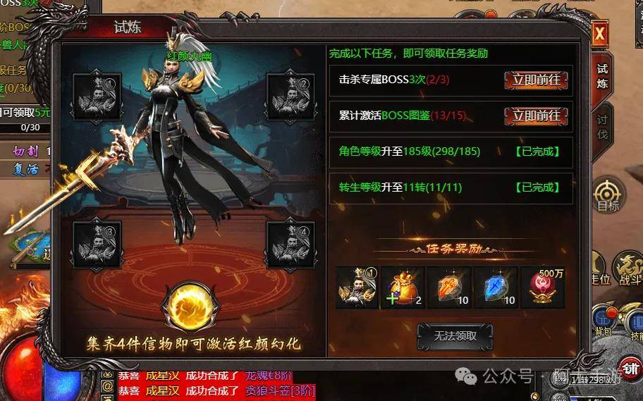 在帝王霸业中红颜助战是个很重要的玩法,极大地提升刷怪效率,除了氪金类的幻化外,还有一种是免费的,点击主线专属红颜,可以看到有四个任务,全部完成之后可以领取下方的奖励,其中有一个奖励叫信物,信物分为四个,只要集齐了四个信物就可以免费激活红颜的幻化形象~