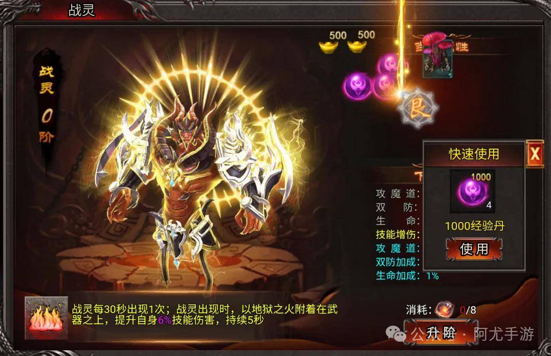 在帝王霸业游戏中战灵可用战灵魂石升级,战灵可增加攻魔道、双防和生命的基础属性,还能增加技能增伤。战灵每30秒出现1次;战灵出现时,以地狱之火附着在武器之上,提升自身6%技能伤害,持续5秒。