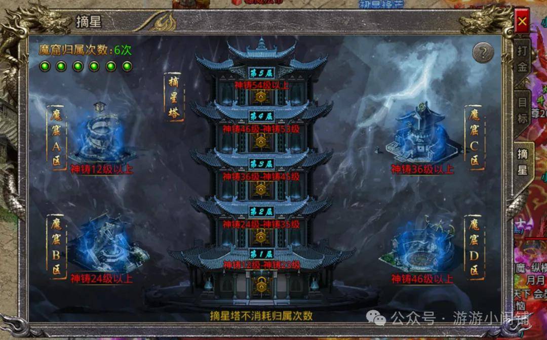 1. 摘星塔(跨服地图,微氪/速升党首选):仅能进入自身神铸等级符合条件的一层,每次进入需消耗对应等级的货币或道具,无多余门槛。每层仅刷新一只至尊BOSS,击杀后必掉落高级异兽装备,层级越高,装备品质越好,是快速成型的核心渠道。