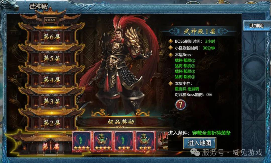 角色进入15大陆后可以解锁武神殿副本,玩家可以通过挑战武神殿获得武将装备和武神图鉴