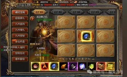 与此同时,九州探秘活动的加入极大丰富了游戏的内容深度。此活动不仅考验玩家的策略布局能力,还鼓励玩家探索未知区域,提升整体游戏体验的趣味性和挑战性。藏经宝阁是游戏中的一项重要系统,共设有九层,每层由九个格子组成。玩家在探索时,需要耗费九州拜帖或10万传奇币来开启每个格子。随着层级逐步升高,开启每一层所需的传奇币也会逐渐增加。