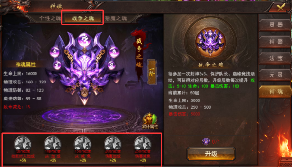 战争之魂是PK党的核心养成线。平时爱打竞技场、3v3的玩家,这层数涨得飞快。升阶后的PK专属属性——对人加成和减免,是野外打架和攻城战的关键。喜欢热血PK的,这条线优先级最高。