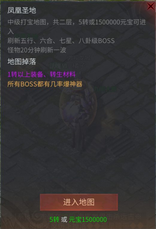 凤凰圣地是一块终极打宝地图,一共有两层,达到五转或者1500000元宝就可以进入凤凰圣地了。