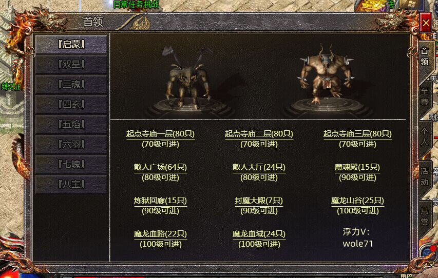 启蒙BOSS分布地点,主要有起点寺庙1-3层、散人广场、散人大厅、魔魂殿、炼狱回廊、封魔大殿、魔龙山谷、魔龙血路、魔龙血域这11张地图的。这些地图有进入等级要求,进入等级范围是70级、80级、90级、100级的。