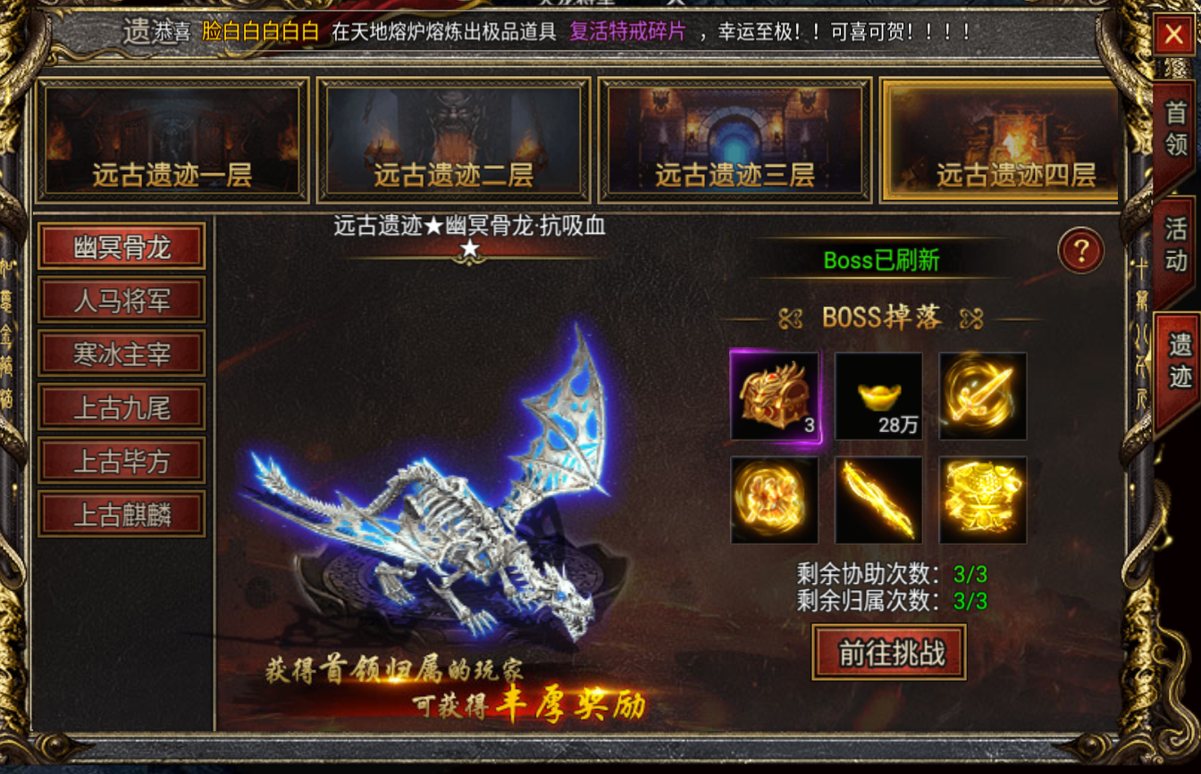 远古遗迹一共有四层,目前已经全部开放,进入要求:第一层第二天,第二层第六天,第三层第十二天,第四层开服达到六十天开启,以上四层我们都已从首领挑战—遗迹处进入哦。