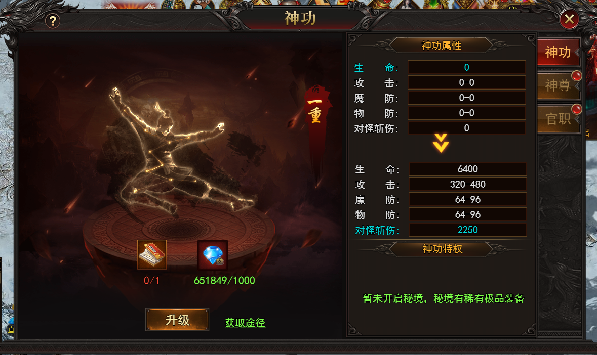 神功乃角色修炼之核心技能体系,蕴含毁天灭地之威。其等级提升依赖神功秘籍,每一本秘籍皆凝聚天地精华,蕴含高深法则。通过吸收秘籍之力,神功等级逐步攀升,每提升一级,皆可解锁更强技能效果或大幅增强属性,助角色在战斗中尽显锋芒,成为主宰乾坤之存在,神功秘籍可以通过提升武魂等级获取。