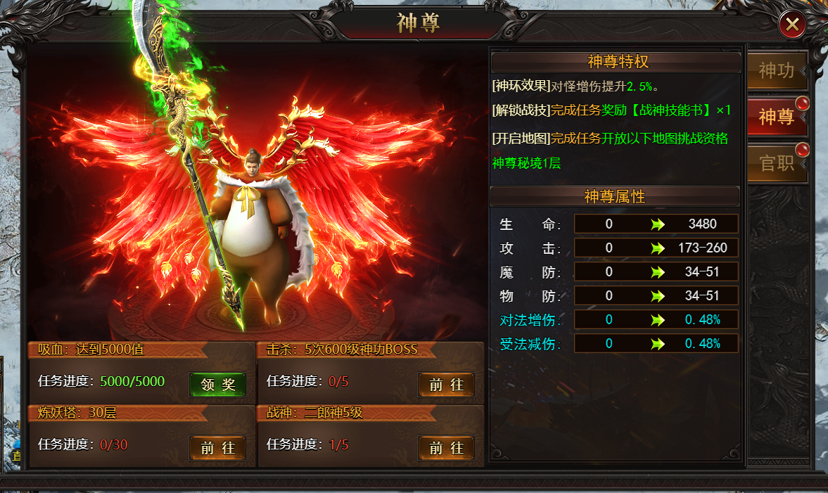神尊为至高身份之象征,代表角色在修炼界之崇高地位。欲提升神尊等级,需完成特定任务,如挑战神功秘境、挑战炼妖塔、升级战神等。等级提升后,不仅能获得巨额属性加成,更可解锁专属特权,如专属副本进入资格尽显超凡地位。