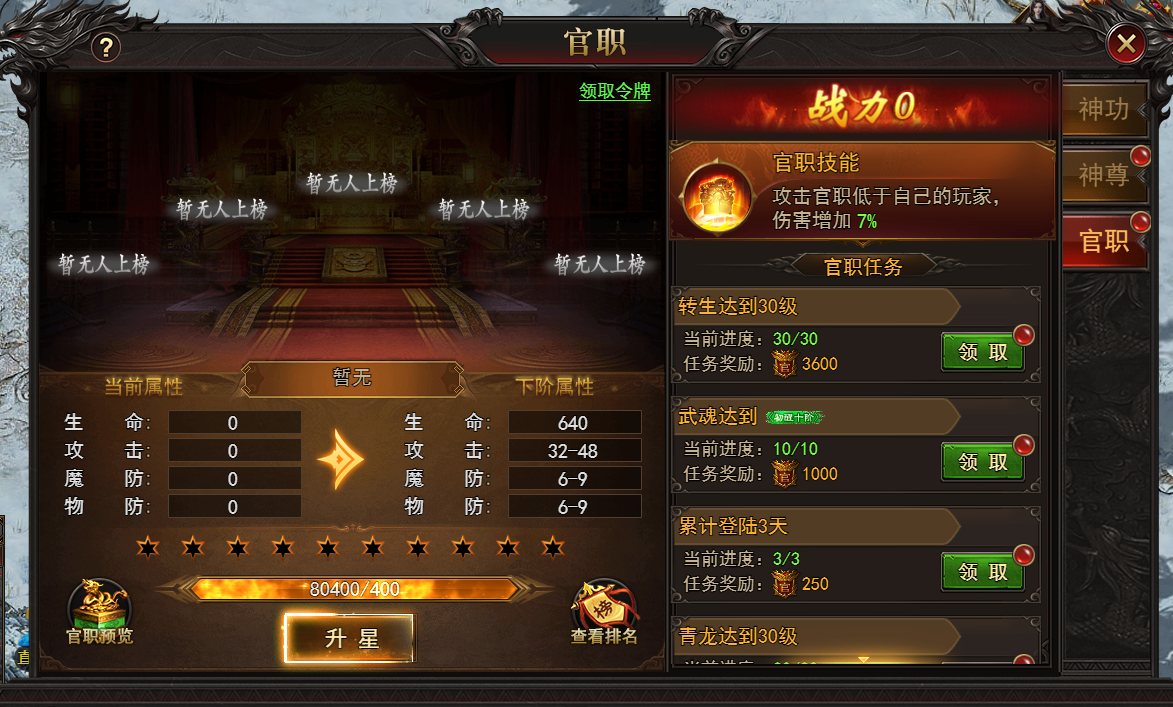 官职是角色于游戏世界中权力与地位之体现,象征着对一方之掌控。通过积累官职令积分即可晋升,每提升一级官职,皆可获得属性增益,且对官职低于自己的玩家有增伤效果