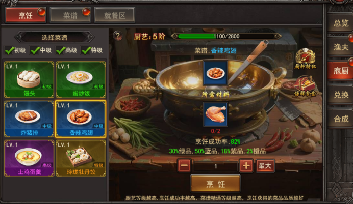 b. 烹饪有成功率,不同菜谱成功率不同,烹饪成功后,会获得菜品,菜品品质随机;