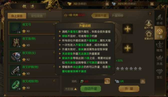 升星石是装备升星强化的关键材料。通过使用升星石,玩家可以提升装备的星级,从而大幅增加装备的属性,提升角色的战斗力。游戏中期,主线任务会要求玩家进行装备升星,因此升星石的需求量非常大。