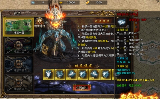 击杀BOSS有概率掉落神威装备,这些装备不仅属性强大,还附带增伤或减伤效果。此外,神威装备还提供神威值,用于进入更高层级的神禁地图。