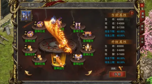 激活部位:想要激活雷神装备的各个部位,需要消耗对应的雷神装备部位。一旦成功激活,就能获得雷神装备的基础属性效果。这些属性相当实用,包括生命加成、攻击加成、防御加成、攻击上限提升以及攻击下限提升等。