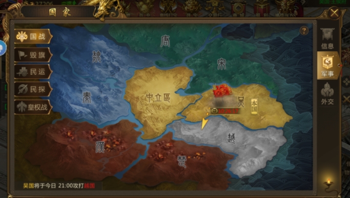 国王或太尉可以在游戏内自由发起国战,宣战后次日晚21点正式开战。