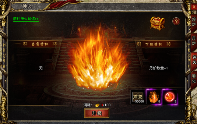 在白蛇传奇游戏中神火一共有9个等级的神火,升级神火不仅可以增加丹炉数量,还能获得声望、金精石、仙丹等珍贵资源。
