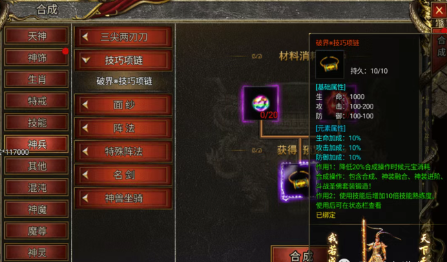 合成技巧项链需20个至尊宝石和1个万能合成石。对小氪玩家而言,每日参与累充活动是获取至尊宝石的主要途径,一个月差不多能得到两颗。凑齐20颗至尊宝石,需要10个月。而氪金大佬则能直接在商城,花5W灵符入手至尊宝石。