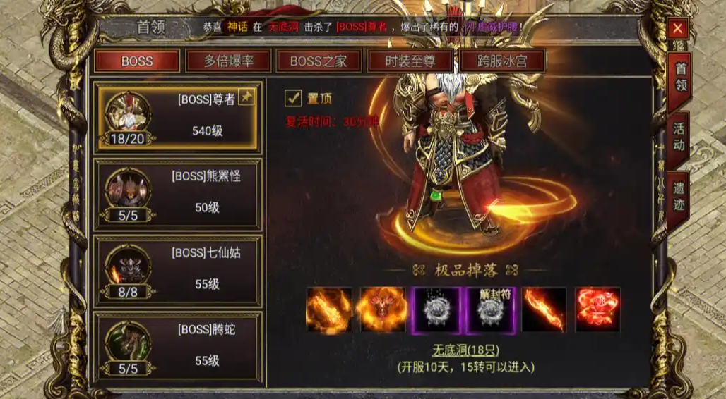 此外,玩家通过开通地仙直升11转。除了上面的地图之外,11-15转生可以刷龙域BOSS;16-20转生可以刷妖域、幻境和秘境里的BOSS获取。大家挑战远古遗迹里的高级BOSS,也有一定概率掉落一些高级转生凭证。