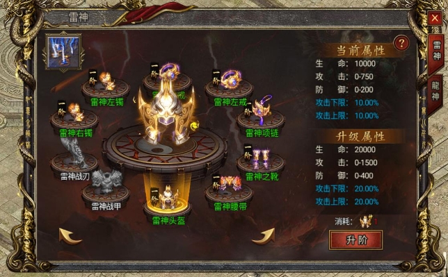 每个部位的雷神装备都能为角色提供不同的属性加成,包括生命加成、攻击加成、防御加成、攻击上限和攻击下限等。