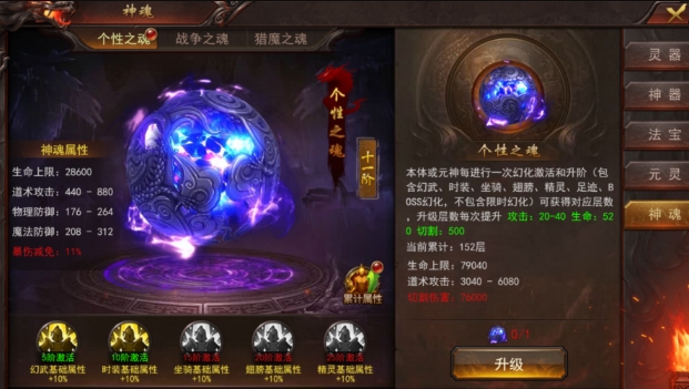 25阶奖励:当个性之魂达到25阶时,玩家将获得幻武、时装、坐骑、翅膀、精灵的基础属性加成。