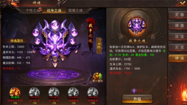 PK加成:战争之魂的升阶还能为玩家带来对人加成、PK加成、PK减免、伤害加成和伤害减免等属性,这些属性在PK时非常有用,能够显著增强战斗能力。