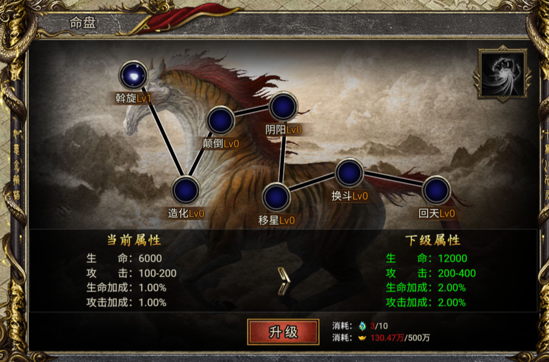 升级命盘可大幅提升角色生命和攻击基础属性和生命加成和攻击加成百分比属性,达到对应等级还可解锁专属特权属性。