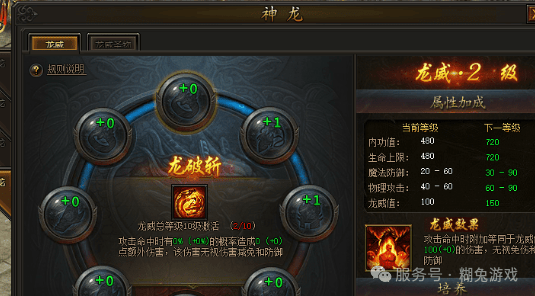 龙威系统有8个部位,每个部位初始等级为0级,最高可达40级。使用赤龙血进行升级,达到一定等级后需使用金龙血继续升级。升级到40级共需消耗85颗金龙血。龙威升级可增加玩家的内功值、生命上限、魔法防御、物理攻击和龙威值等属性。当龙威系统培养到一定等级后,玩家将获得“龙破斩”专属技能。