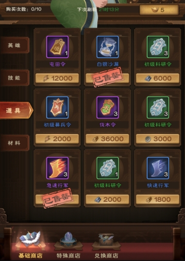 兑换商店里,每天打折的宝物碎片和高级宝物箱子一定要买。中级练兵令按需兑换,而高级练兵令非常稀缺,建议留着确定主将之后再兑换。