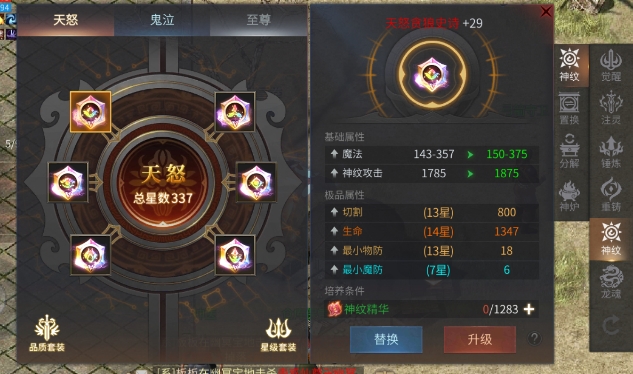 神纹每个类型都有一套品质套装加成和星级套装加成,属性非常强大。通过合理搭配,三套神纹可以累计增伤27%,减伤27%。三套史诗神纹满6条词条属性且达到15星,总计540星,即可达到顶级全满状态。