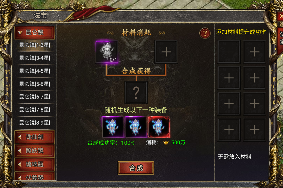 合成[1-3星]的法宝需要未解封的法宝加上解封符,三星以上的法宝合成需要使用上一级法宝加上法宝解封符,随机获得上一级法宝或者下一级法宝。