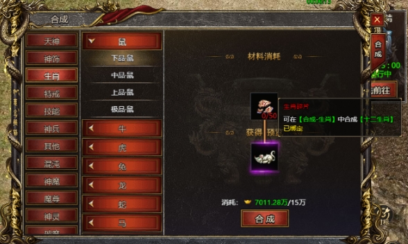 操作步骤:玩家需要进入游戏的合成系统,找到生肖界面。在生肖界面中,玩家可以选择消耗一定数量的生肖碎片来合成不同品阶的生肖装备。