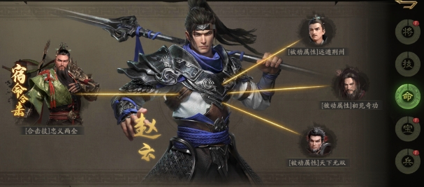 进入游戏后,玩家会面临初始4对宿命将的选择,分别是赵云-关羽、郭嘉-张辽、吕布-貂蝉、孙策-孙尚香。这四对组合各有特色,玩家可根据个人喜好进行选择。不过,选定后尽量不要更换,因为前期集中资源培养一两个武将,比平均分配资源要更有效率,后期在战斗中也会更具优势。