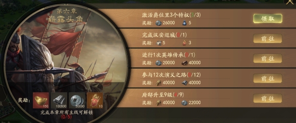 按照主线任务进行推进,第一天最高可以推进到第6章。在完成主线任务的过程中,同步将府邸升级到8级。每次府邸升级都有相应的建筑升级条件,而每次建筑升级都需要一定时间。如果不想等待,可以使用沙漏加速,当然,元宝也可以直接完成建筑升级,但建议还是留到后续使用。
