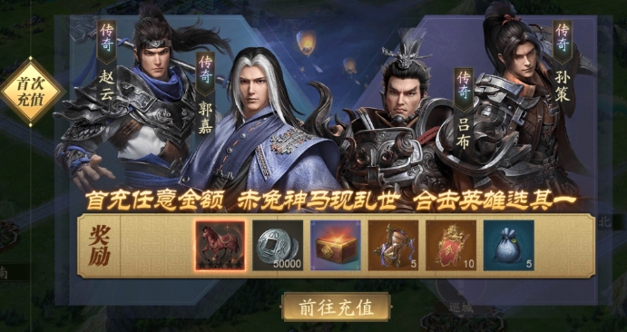 游戏设有首充活动,共分为4个档次。首档包含坐骑-赤兔马、5万银币、1个合击英雄自选箱、5个黄金沙漏、10个点将令以及5个锦囊,仅需充值6元即可获得。第二档30元充值包含5万银币、1个宿命英雄自选箱、5个黄金沙漏、10个点将令、5个锦囊以及20个马缰。第三档68元充值包含5万银币、1个合击英雄自选箱、5个黄金沙漏、10个点将令、5个锦囊以及40个马缰。第四档128元充值包含5万银币、1个宿命英雄自选箱、5个黄金沙漏、10个点将令、5个锦囊以及80个马缰。