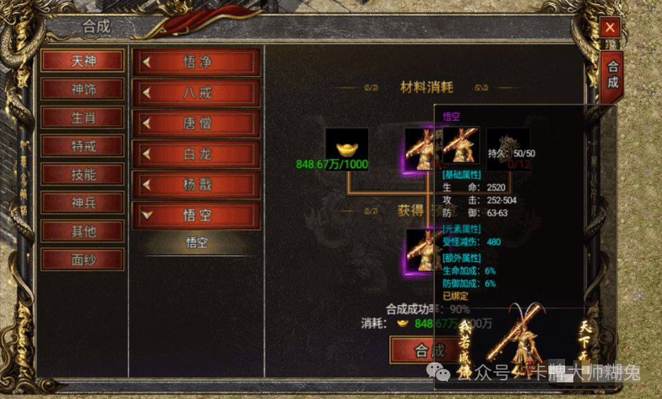 天神系统共有悟净、八戒、唐僧、白龙、杨戬、悟空六个部位,每个部位对应独特属性加成,角色达到70 级后,参与每日限时活动“三打白骨精” 即可解锁合成界面。