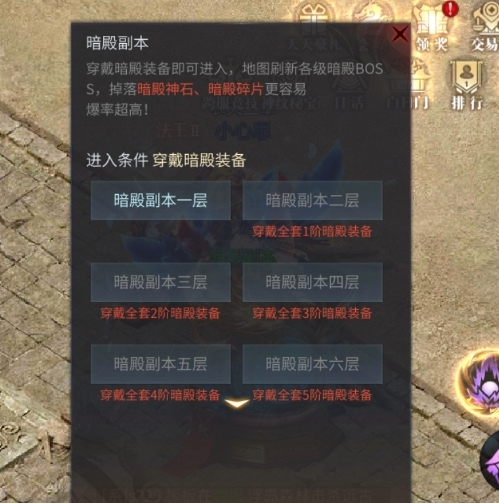玩家穿戴暗殿装备即可进入,地图刷新各级暗殿BOSS,掉落暗殿神石、暗殿碎片更容易,爆率超高!