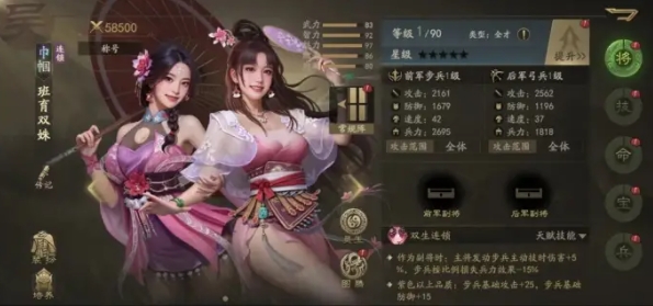 神将化后的班育双姝可以实现100%的连锁效果,并且主动技能可以额外释放一到两次。这使得班育双姝在战斗中可以发挥出类似董白的效果,甚至在某些情况下,其魅力高于对手时,连锁伤害可以翻倍。目前虽然没有太多战报可以参考,但可以肯定的是,班育双姝至少是一个仅次于董白的第一档次主将。