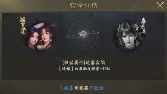 连锁效果:当敌方前军受到伤害时,后军有50%的概率受到一半的伤害。如果触发宿命,概率会提升至65%。