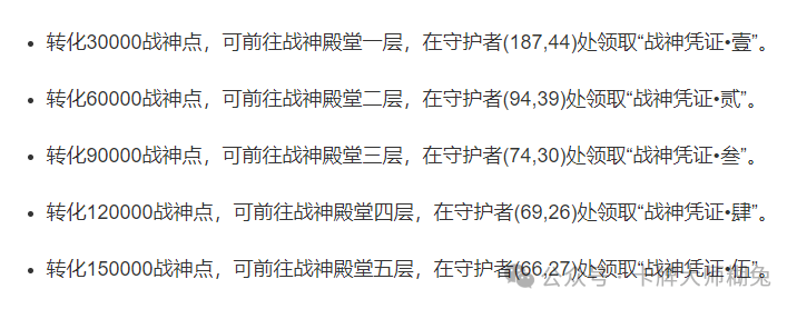 那么,这些披风凭证该如何获取呢?在“战神殿堂”的每层守护者处,玩家都可以领取到披风凭证。地图中共有5个守护者,他们的具体坐标如下: