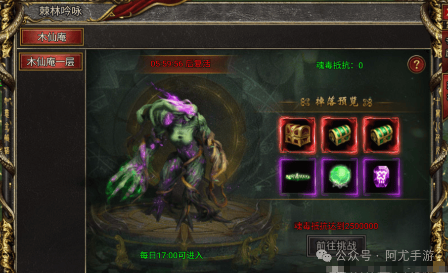 BOSS带有魂毒属性,攻击会使自身中毒,每秒扣除高额血量。穿戴灵装可以提升魂毒抗性。棘林吟咏可进入的层数与魂毒抵抗属性值相关,层数越高奖励越好。每天17点刷新神木之灵,造成伤害会计入排行榜。