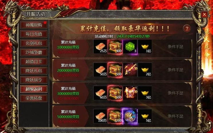 超级返利活动是《白蛇传奇》中获取丰厚奖励的重要途径。通过合理利用角色创建天数,玩家可以享受到丰厚的返利奖励,包括诛仙武器和衣服、雷神自选箱等珍贵资源。建议玩家选择折扣服参与活动,合理规划充值金额,并密切关注活动公告,以确保能够充分利用超级返利活动提升角色实力。