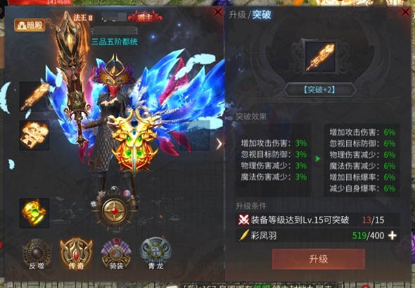 神剑和神甲:低等级的传奇剑甲属性加成可能并不高,但在升级和突破到一定程度时,其带来的属性加成是显著的,尤其是忽视防御和套装无敌效果。