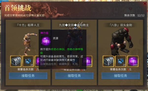 神剑、神甲和神戒:玩家在角色达到1转后,完成击败BOSS的任务即可获得初级神剑、神甲和神戒。这些装备位于独立的传奇装备页面,不在常规装备位。