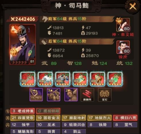 武将:推荐关羽,砍头技能“迎风一刀斩”非常强大,技能推荐“破军一击”“狂狮”,军阵推荐“青龙”,军策推荐“打草惊蛇”“乘胜追击”。