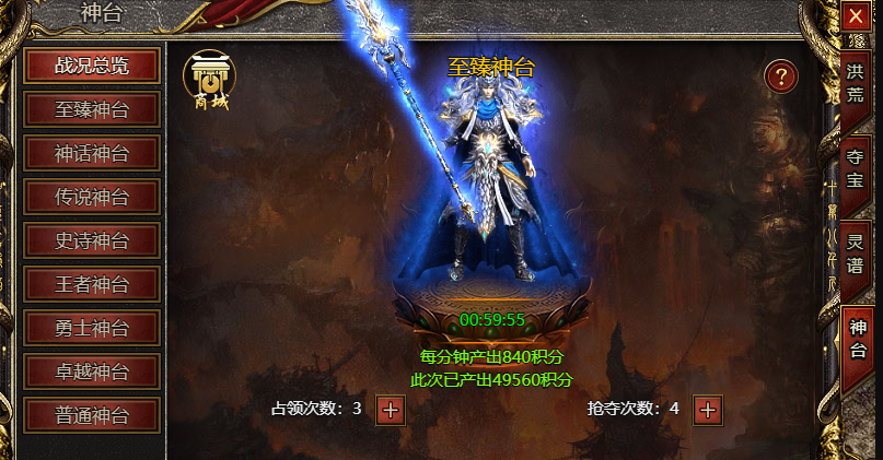 洪荒神台以每周为一个赛季,周一0点会进行积分重置。玩家每天有5次初始占领及挑战机会,占领空闲神台消耗占领次数,抢夺被占领的神台消耗抢夺次数。占领神台不会拥有保护时间,抢夺神台则有30分钟的保护时间,神台占领上限为8小时,且每次最多占领一个神台。