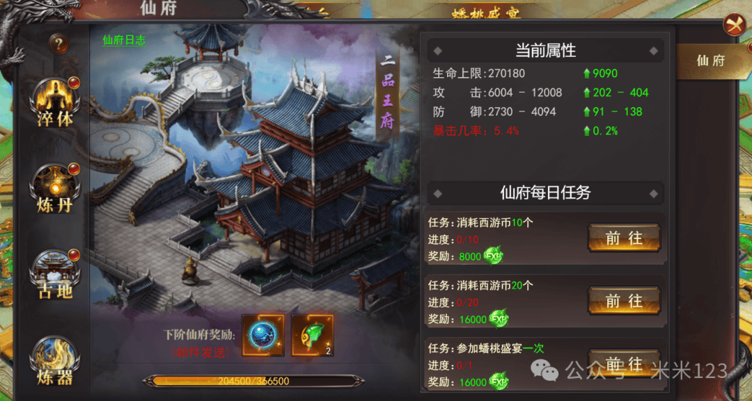 1.仙府提升:每天完成对应西游任务增加经验,可提升对应的仙府等级增加属性以及开启对应的功能