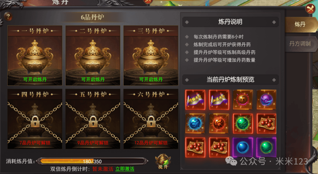 2.炼丹时间:炼制丹药为8小时一次,最多可同时开启6炼丹